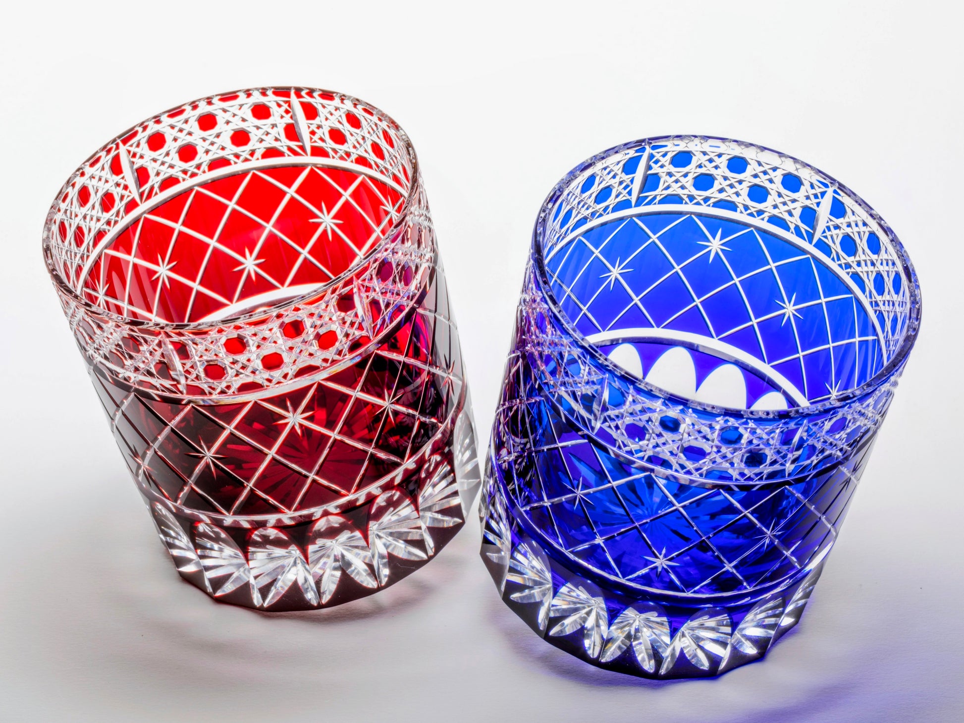The design features a traditional Edo Kiriko "Yarai" pattern overlaid with a star pattern, and an octagonal basket weave pattern on the top. The basket weave pattern is modeled after a bamboo basket and is said to have the power to ward off evil spirits.