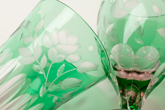 彩鳳では従来のイメージにある赤や青ばかりではなく、様々な色のグラスに伝統技術を活かした文様を施しています。