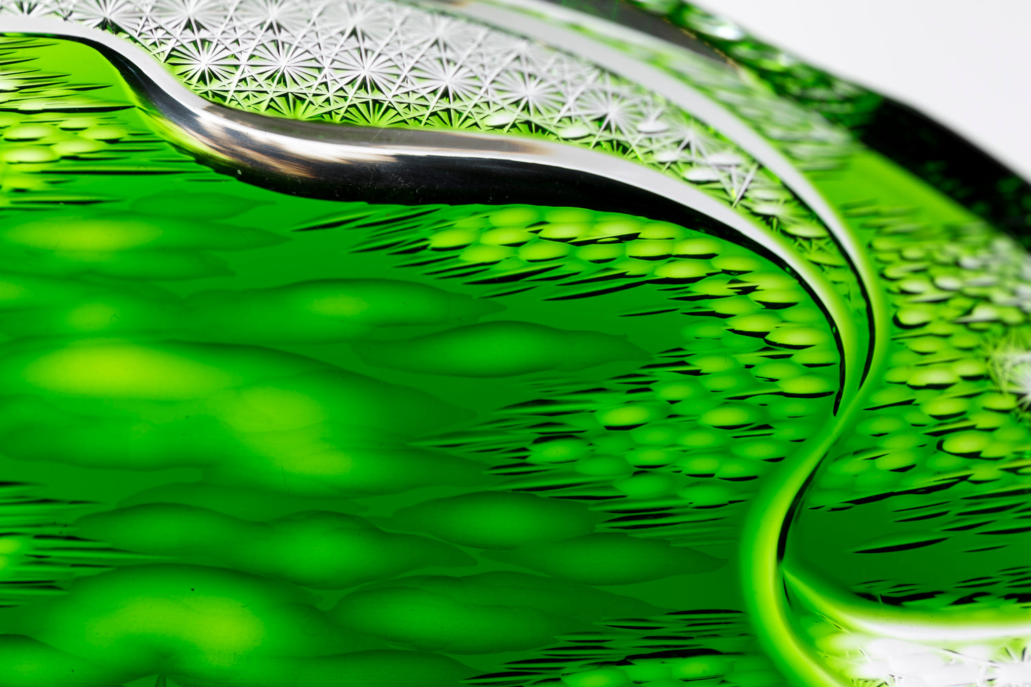 当時は、透明な鉛ガラス(透きガラス)に、鑢の金棒と金剛砂によって切子細工を施し、木の棒と金剛砂で磨きあげる、熟練した手作業により製作されていました。