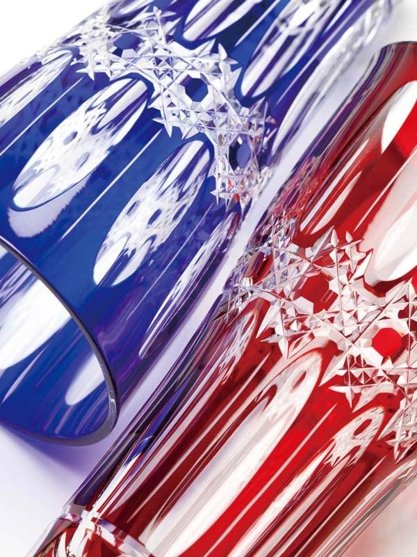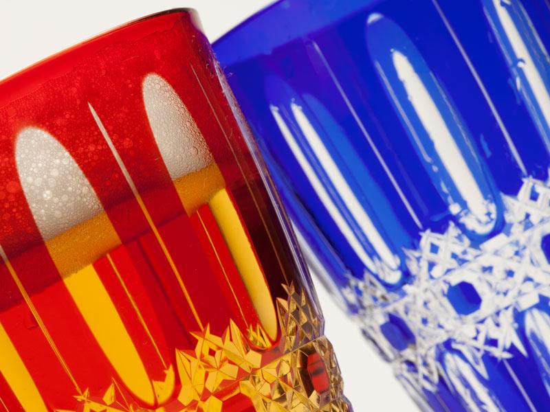 工芸士が手作業でカットした江戸切子。 伝統的あるいは創作された文様で構成されています。光の拡散性の高いソーダ硝子を生地に使用しています。彩鳳でデザインから制作まで一貫しておこなっています。