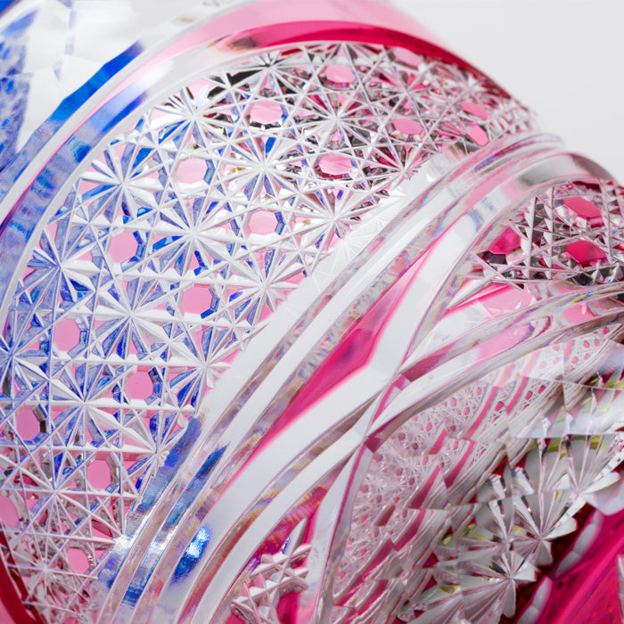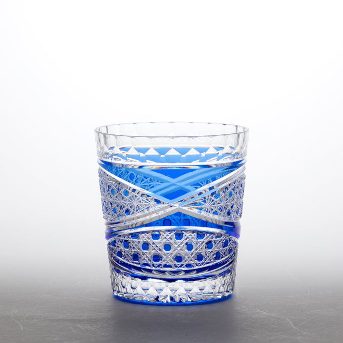 自由に飛び交う変形の矢来文様の中に、菊篭目文様と篭目文様をあしらったグラスです。江戸切子職人の技術の粋を詰め込みました。