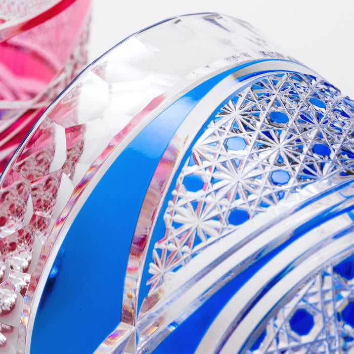自由に飛び交う変形の矢来文様の中に、菊篭目文様をあしらったグラスです。江戸切子職人の技術の粋を詰め込みました。