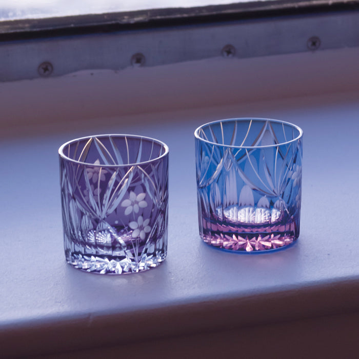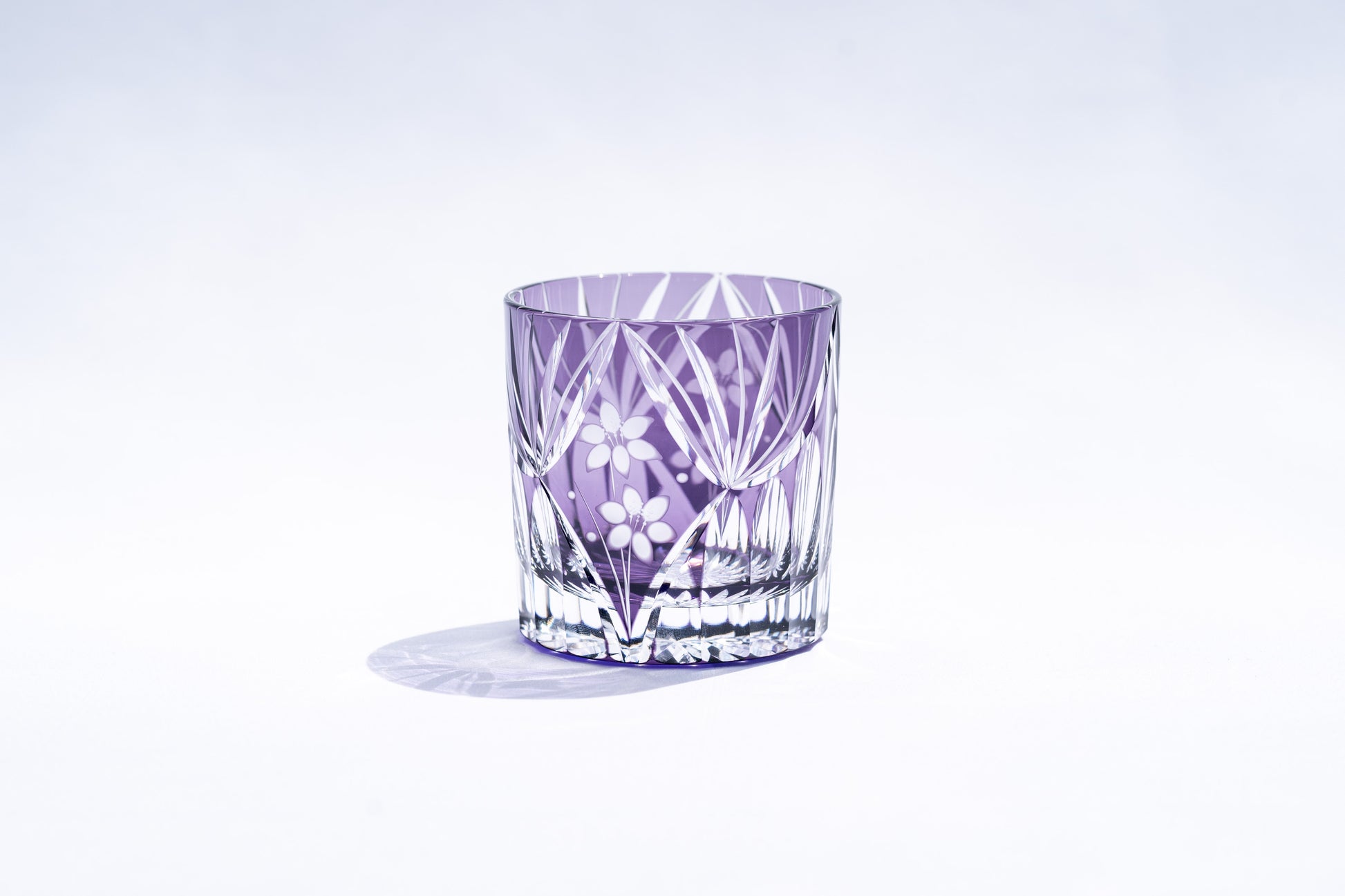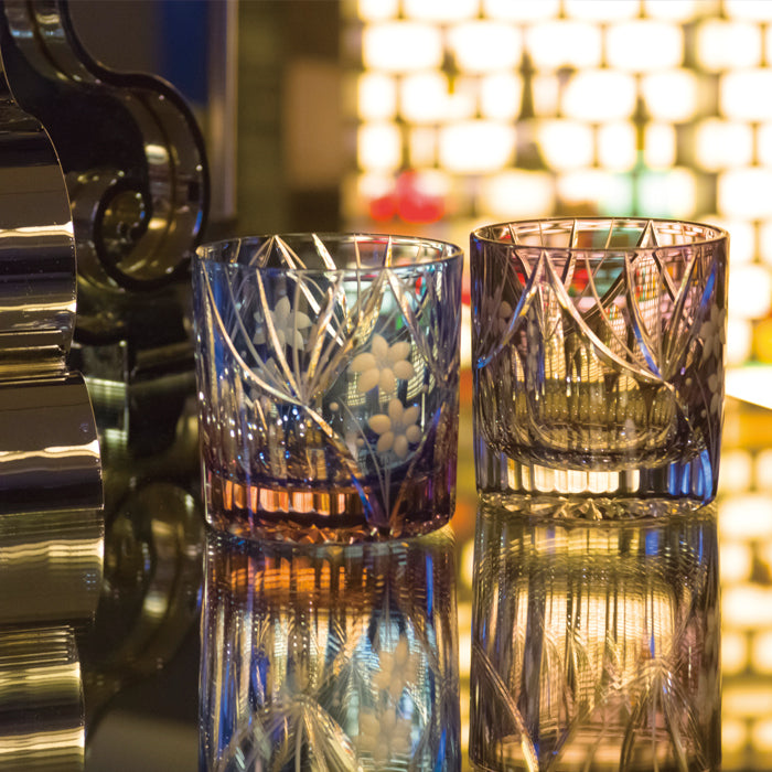 江戸切子の伝統文様「矢来文様」で菱籠を作り、その中に花を表現した彩鳳オリジナルの「花籠文様」です。矢来文様は竹垣などの垣根をモチーフにした文様で、魔除けの意味があります。