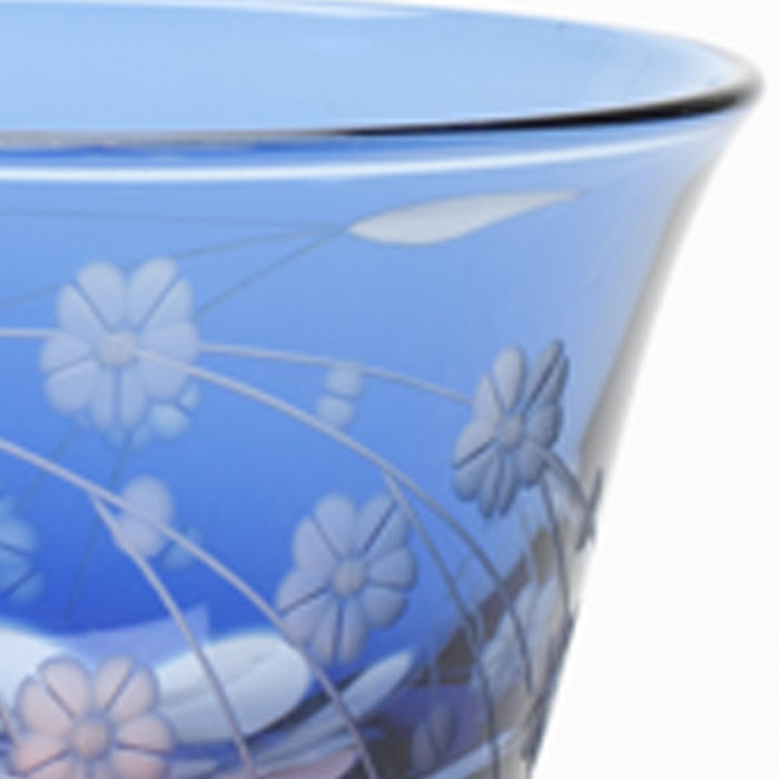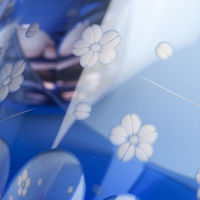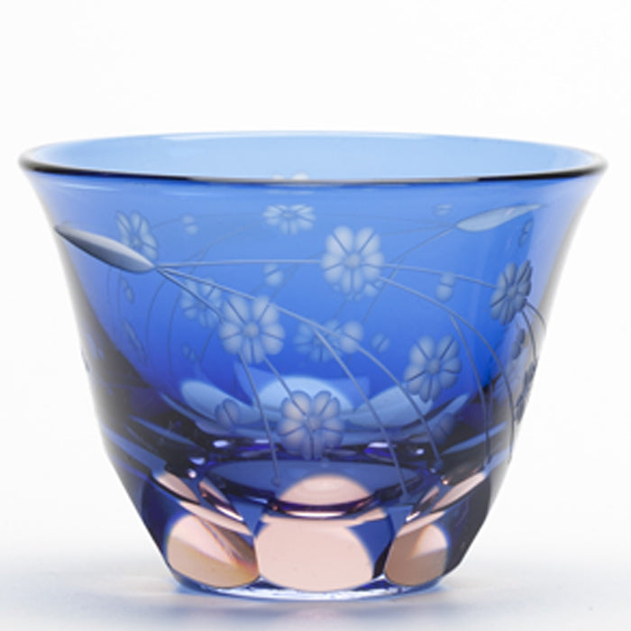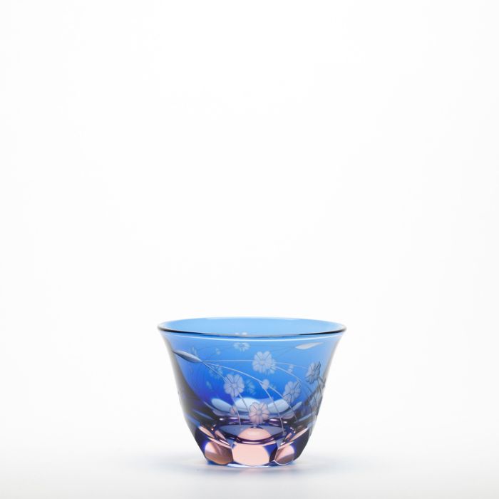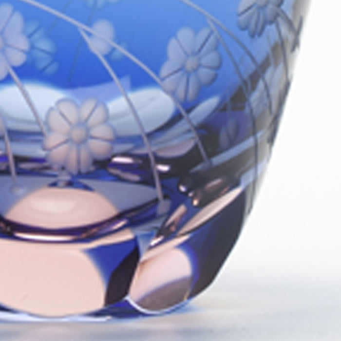 ピンクの下地に水色を重ねた珍しい色被せ硝子に桜柄をカットしました。青空に映える満開の桜をイメージしたグラスです。
