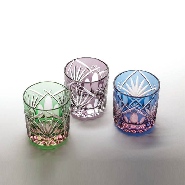工芸士が手作業でカットした江戸切子。 伝統的あるいは創作された文様で構成されています。光の拡散性の高いソーダ硝子を生地に使用しています。彩鳳でデザインから制作まで一貫しておこなっています。
