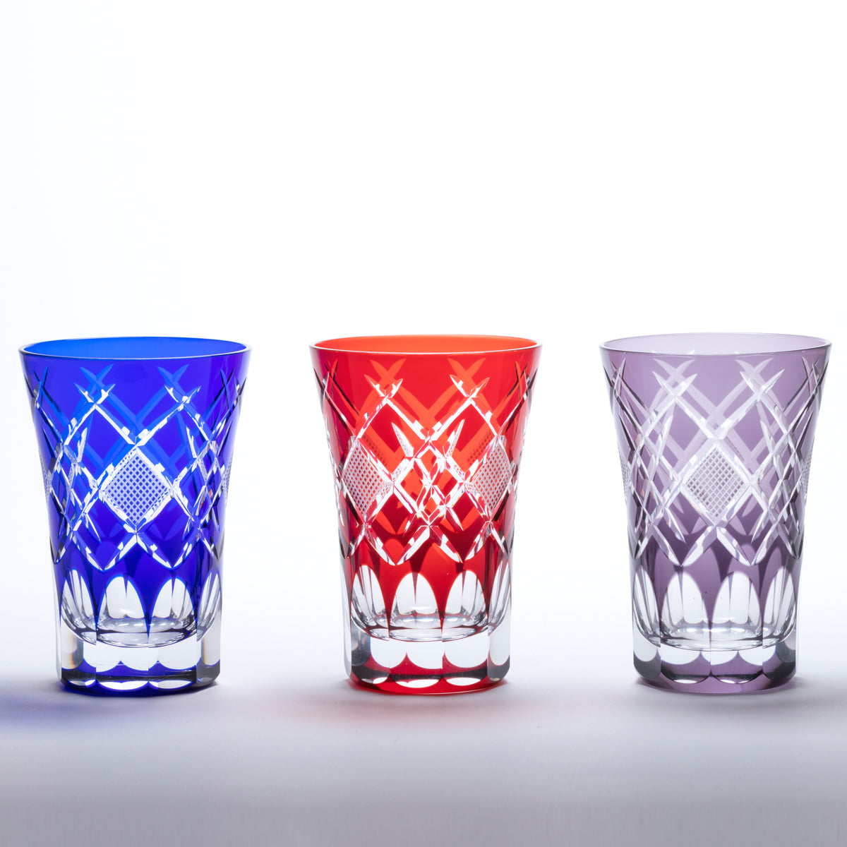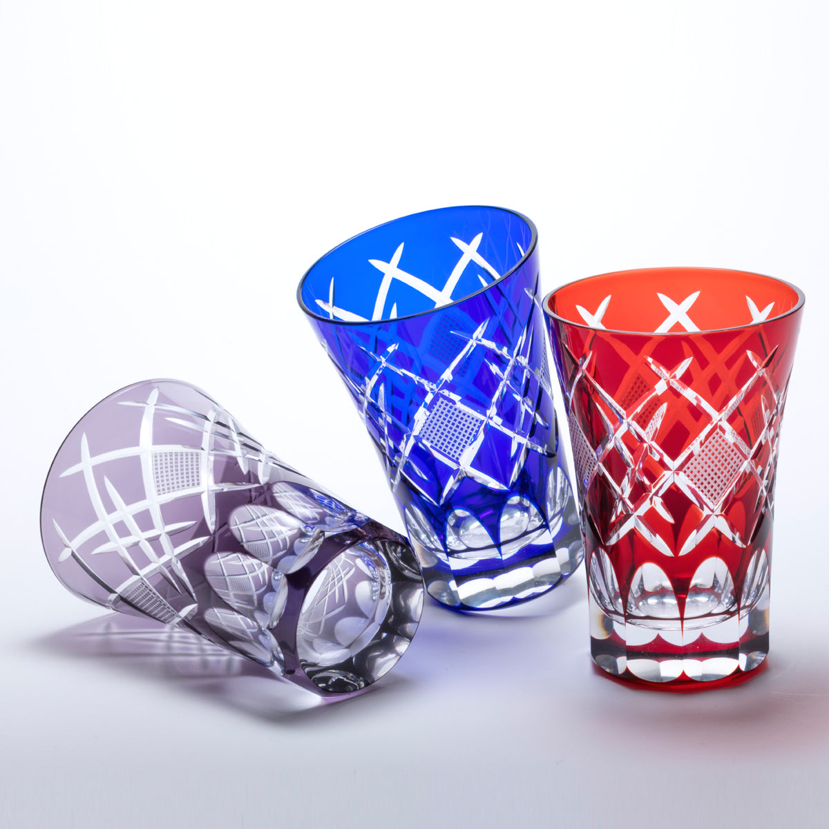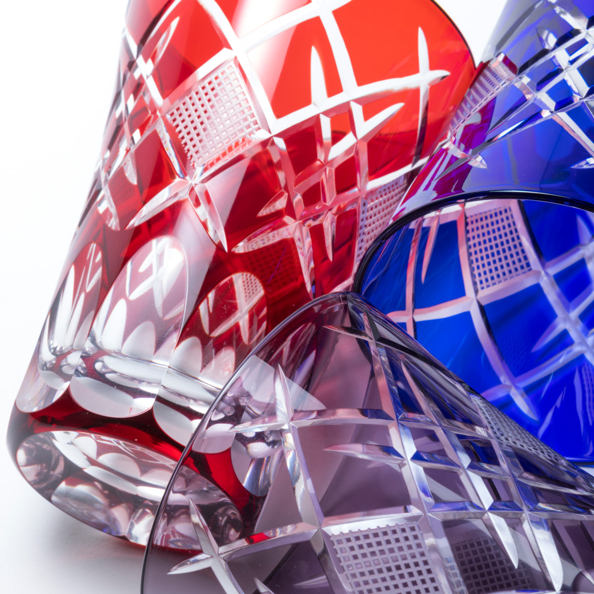 工芸士が手作業でカットした江戸切子。 伝統的あるいは創作された文様で構成されています。光の拡散性の高いソーダ硝子を生地に使用しています。彩鳳でデザインから制作まで一貫しておこなっています。