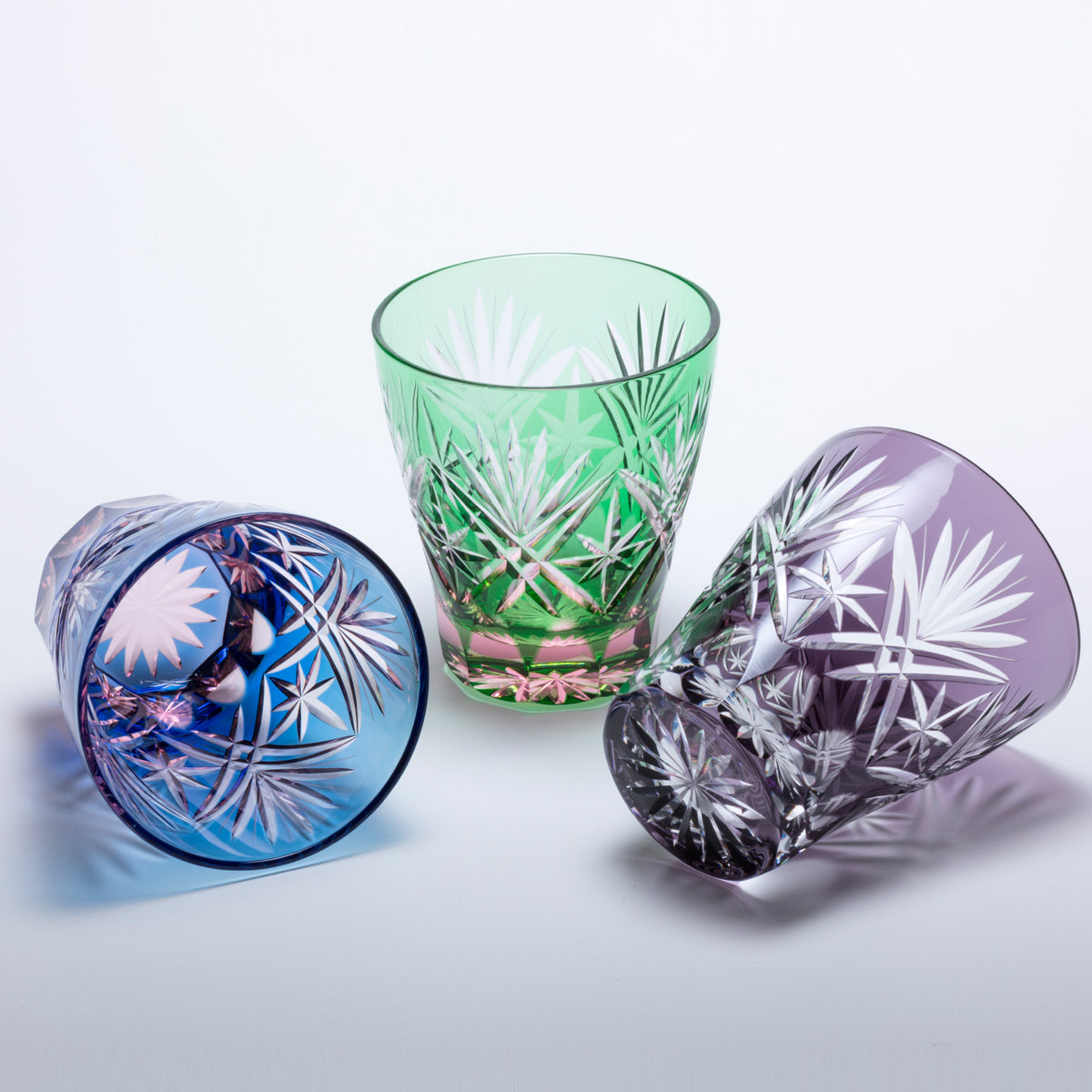 工芸士が手作業で彫削した江戸切子。 伝統的あるいは創作された文様で構成されています。彩鳳でデザインから制作まで一貫しておこなっています。